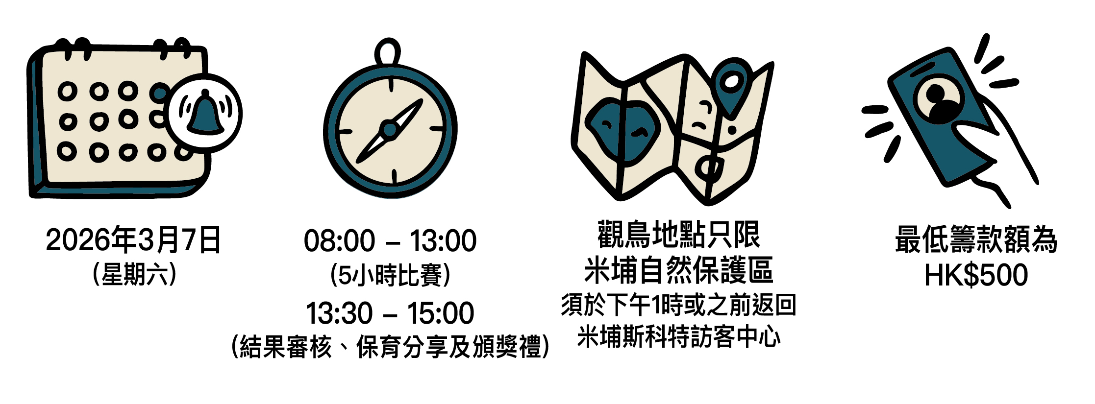 | 米埔考察時間(比賽前) | 2026年2月9日至3月6日 (星期日、公眾假期及農曆新年除夕除外) |